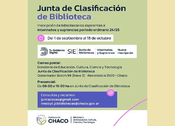 Por consultas, escribir a los correos meccyt.jcbibliotecas@chaco.gov.ar o juntacbcas@gmail.com.